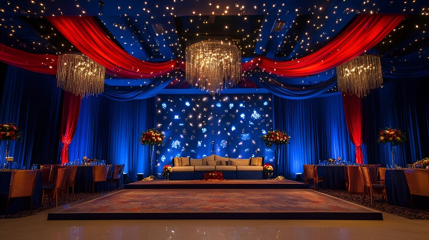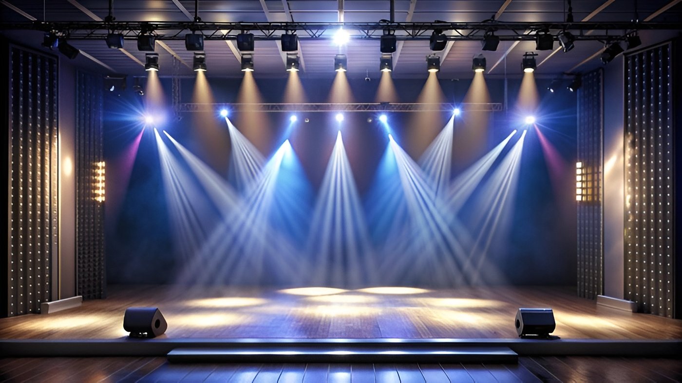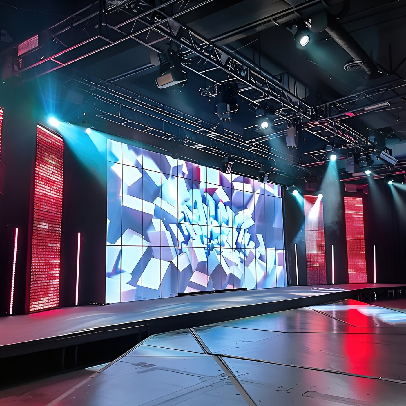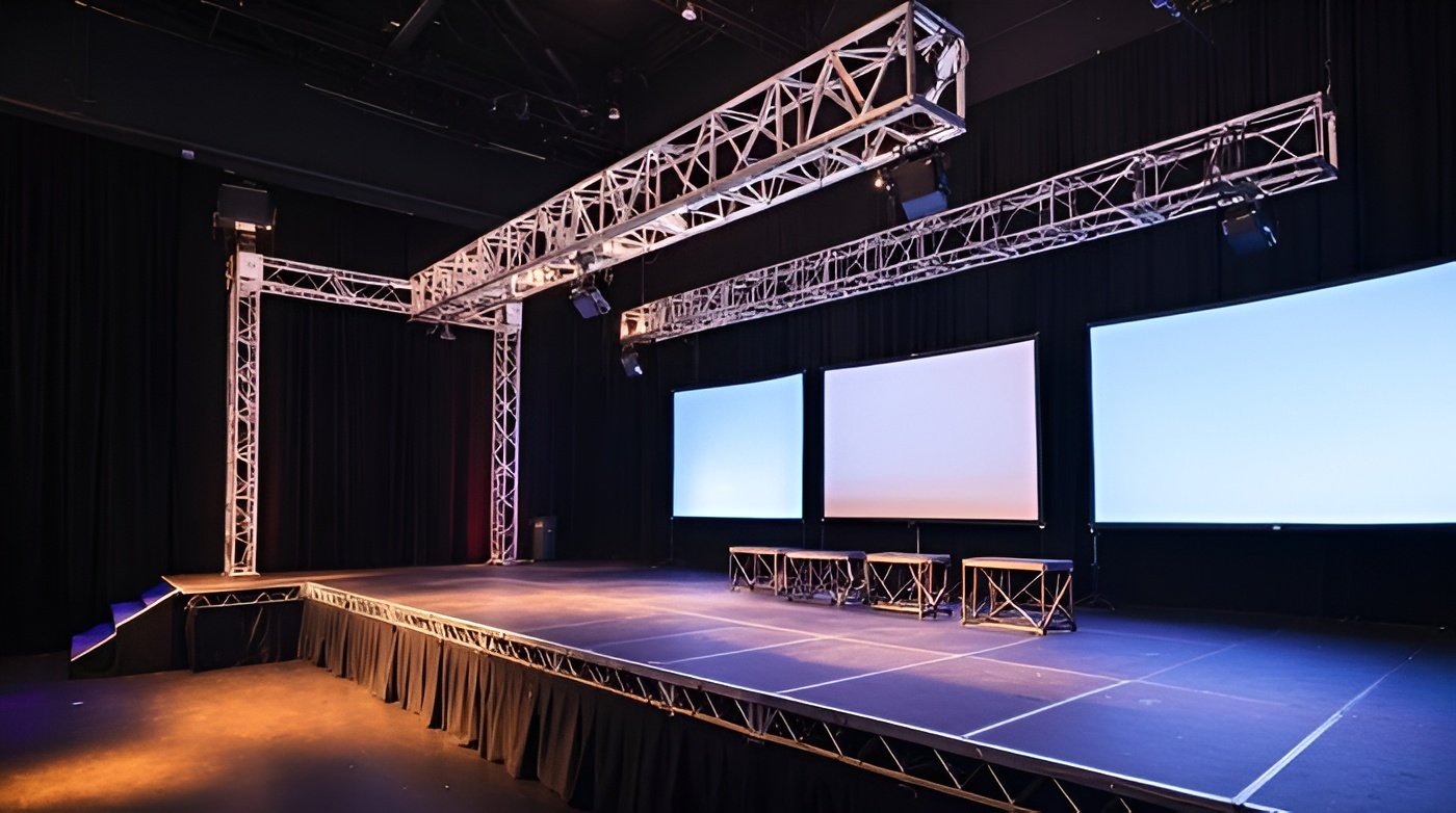 Custom stage setups with risers, lighting, backdrops, and safe install